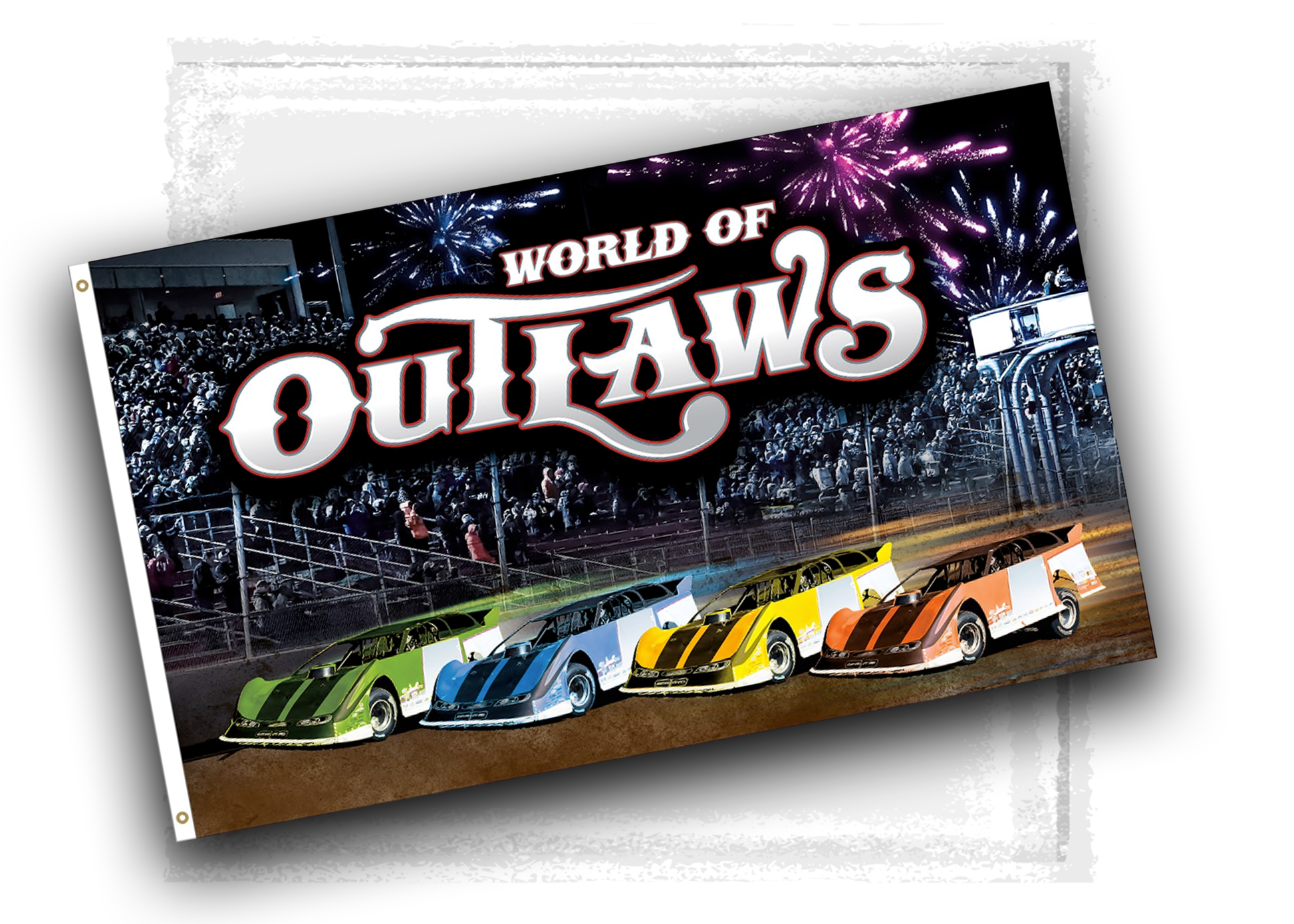 This high-quality flag measures 3 feet by 5 feet and features a bold, one-sided design showcasing the World of Outlaws 4-Wide Late Model branding. Crafted for durability, the flag is made from premium fabric that ensures vibrant colors and long-lasting wear, even when displayed outdoors. The grommets at the top and bottom corners allow for easy hanging and secure attachment to poles, making it perfect for race fans to proudly show off their support. Whether you're waving it at a race event or flying it at home, this flag captures the spirit of dirt track racing and the excitement of late model racing.