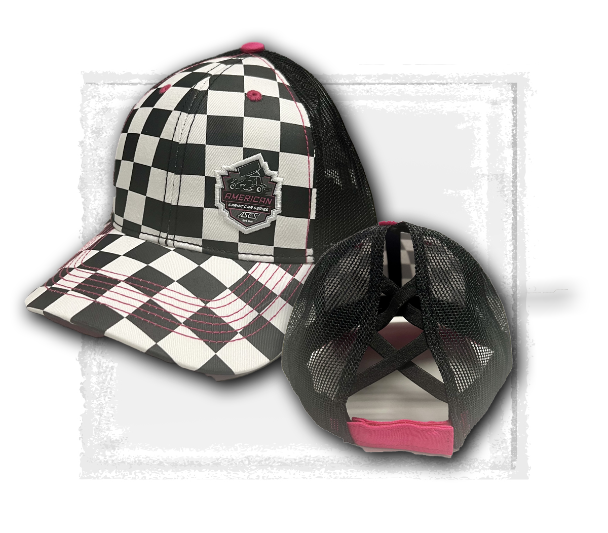 Built for comfort and style at the track, the Checkered Ponytail Hat features a bold ASCS design with a black-and-white checkered pattern. The criss-cross elastic backing accommodates high or low ponytails, while the Velcro enclosure ensures a secure, adjustable fit. Perfect for dirt track racing fans on the go.