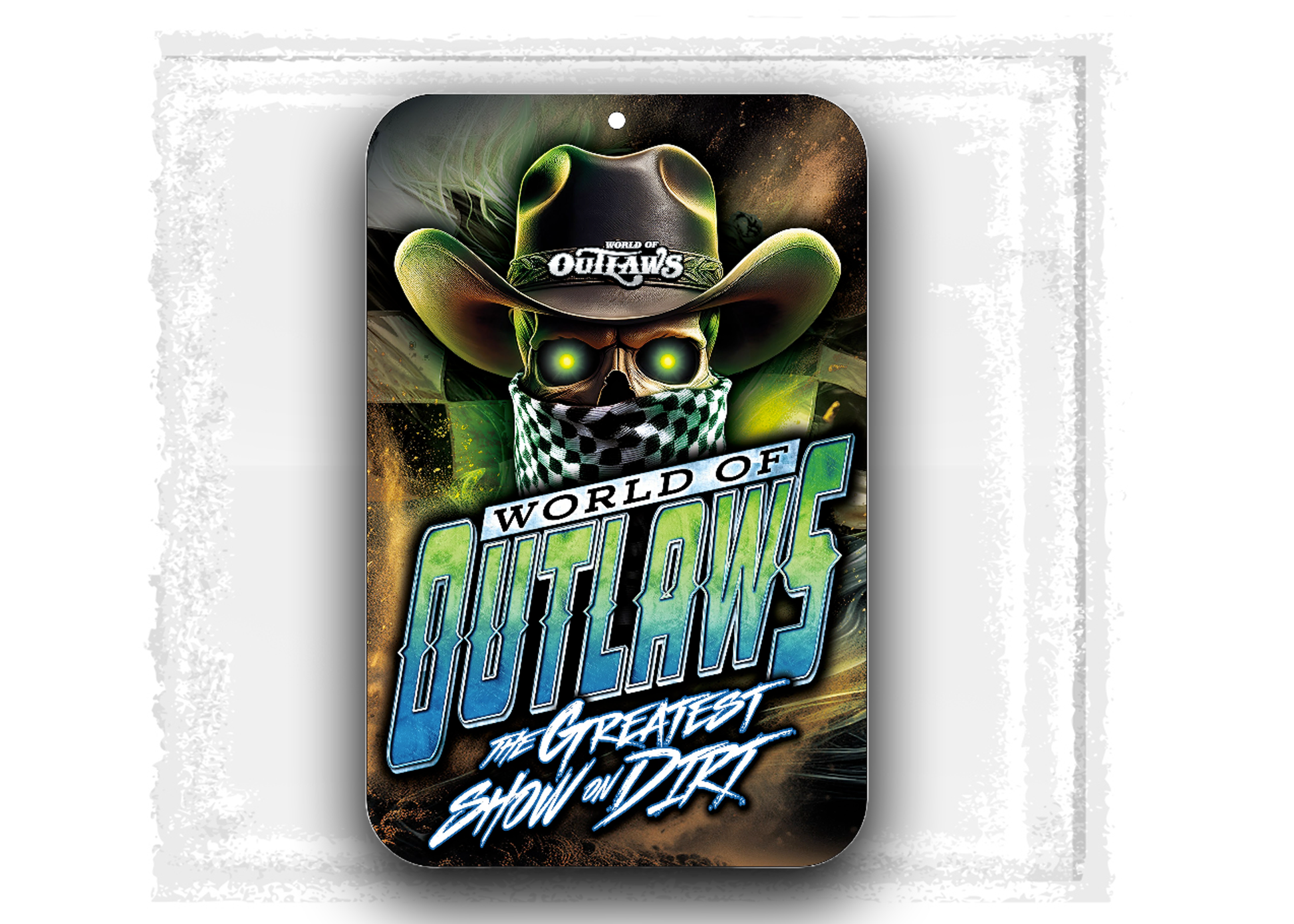 Bring the thrill of the dirt track home with this eye-catching World of Outlaws sign, crafted from durable styrene for long-lasting indoor or outdoor use. Measuring 11” x 17”, it features a bold and rugged skull with glowing eyes, capturing the rebellious spirit of dirt track racing. The high-energy design includes textured dirt track elements, flying mud, and the iconic World of Outlaws branding, making it the perfect addition to your garage, man cave, race trailer, or fan collection.