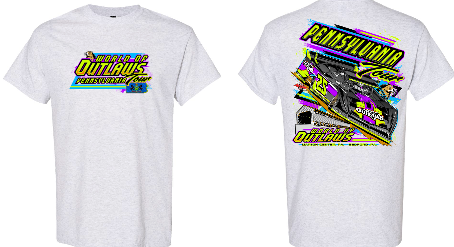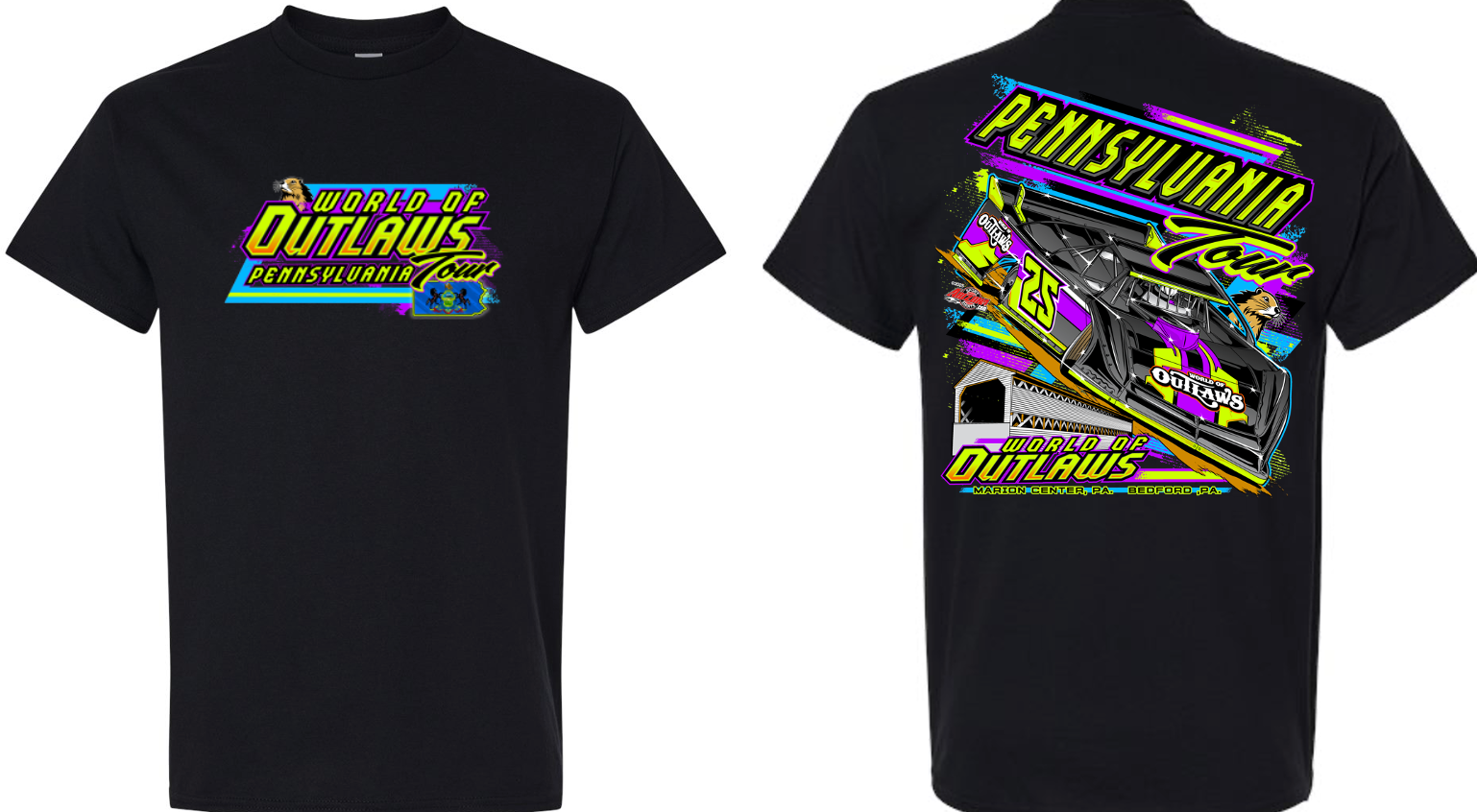 Gear up for dirt racing’s most thrilling tour with this limited-edition tee celebrating the World of Outlaws Late Model Series stops at Marion Center Raceway and Bedford Speedway. Featuring a single, high-impact Late Model graphic and bold tour text, this shirt captures the raw power and speed of Pennsylvania’s premier outlaw events. Clean, classic, and built for race fans—no frills, just dirt.