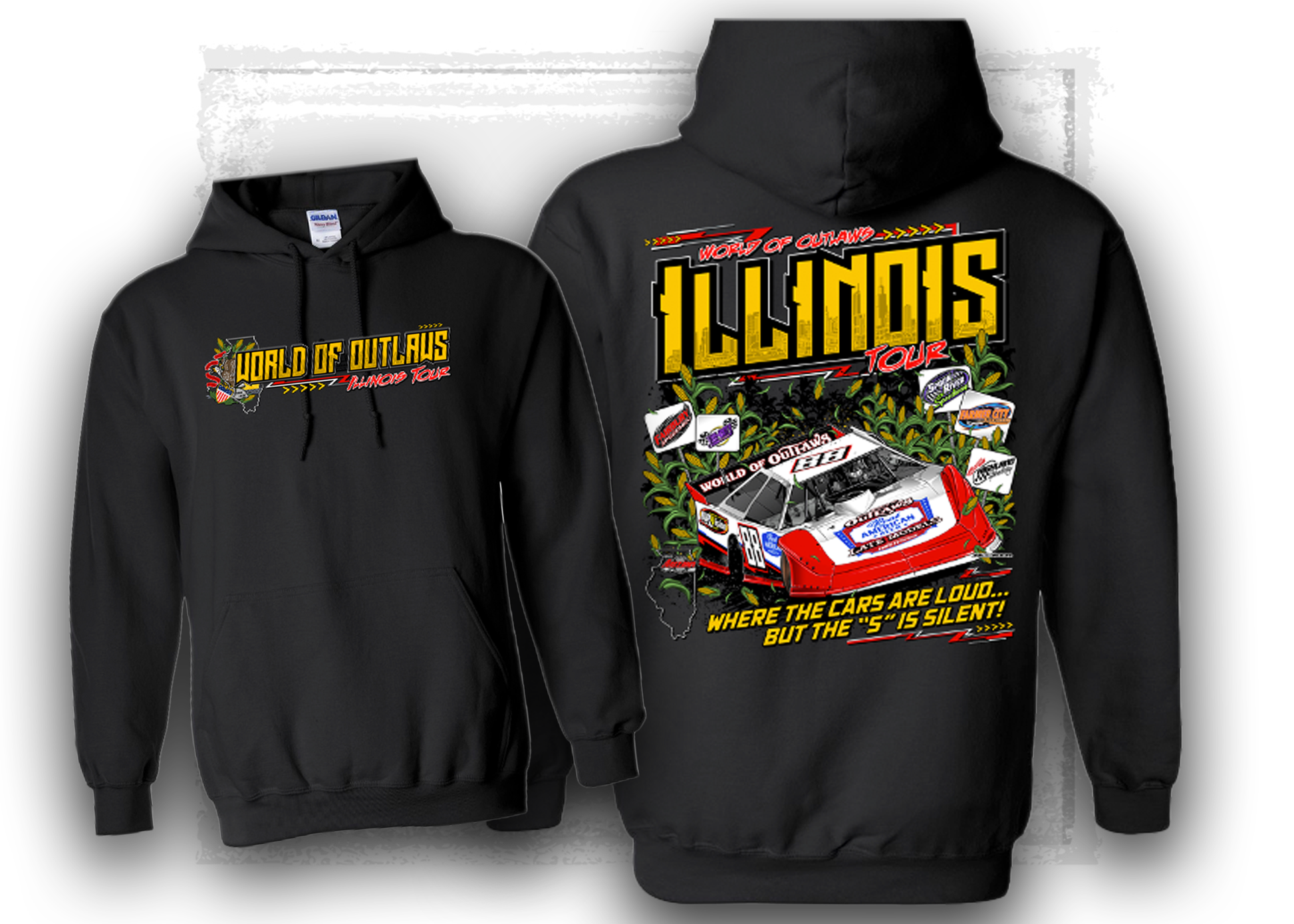 Where the cars are loud, and the S is silent. This hoodie roars with a bold design featuring a powerful late model slinging black dirt as it tears down the track, with iconic Illinois cornfields rising in the background. Whether you’re trackside at Fairbury, Spoon River, Highland, Farmer City, or Tri-City, or just showing off your dirt track pride, this hoodie keeps you cozy and stylish.