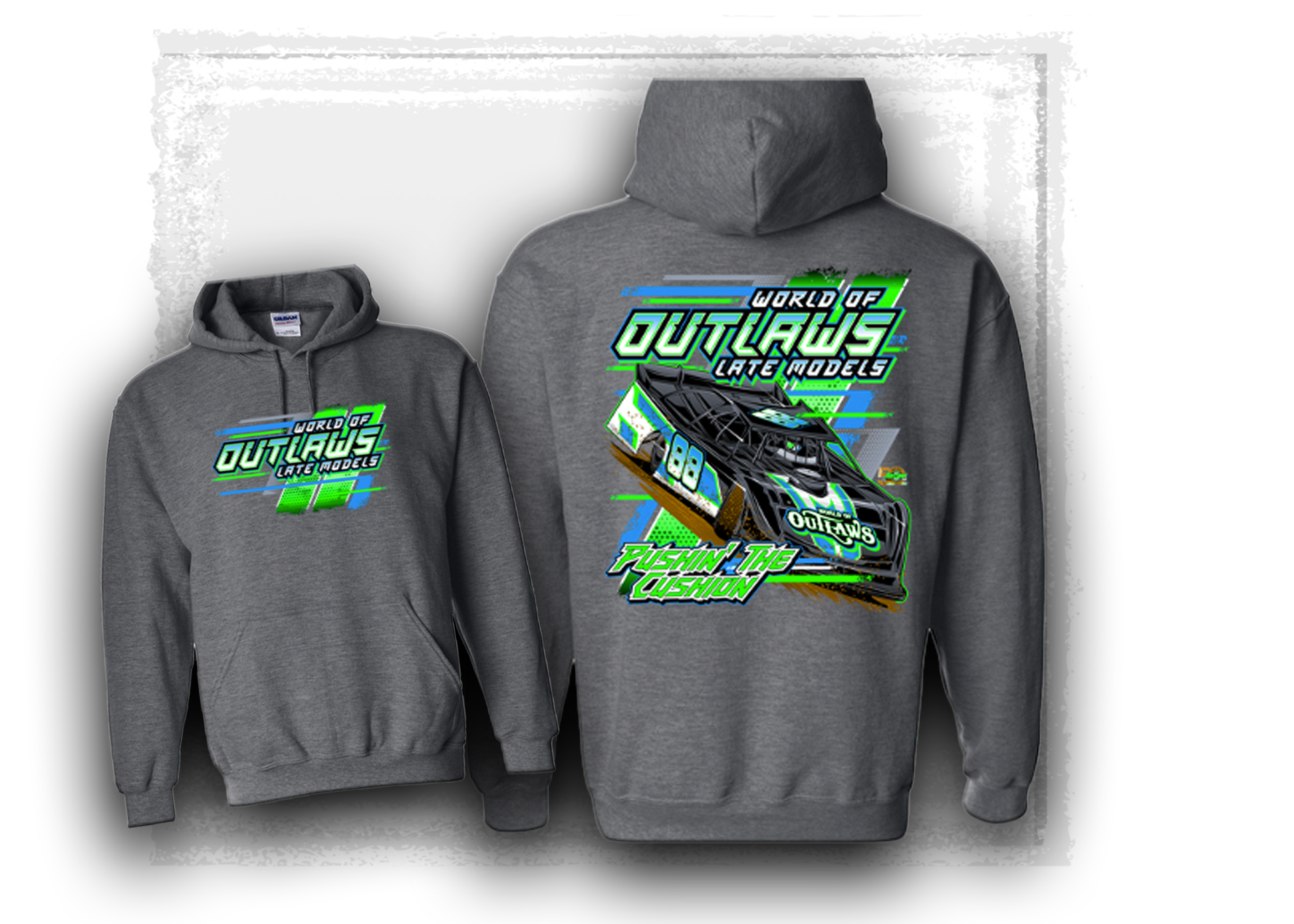 This bold hoodie celebrates the high-speed thrill of dirt track racing. "Pushin' the Cushion" refers to drivers riding the high line—right up against the loose dirt buildup, or "cushion," at the top of the track—to gain speed and make daring passes. A must-have for fans who love racing on the edge.