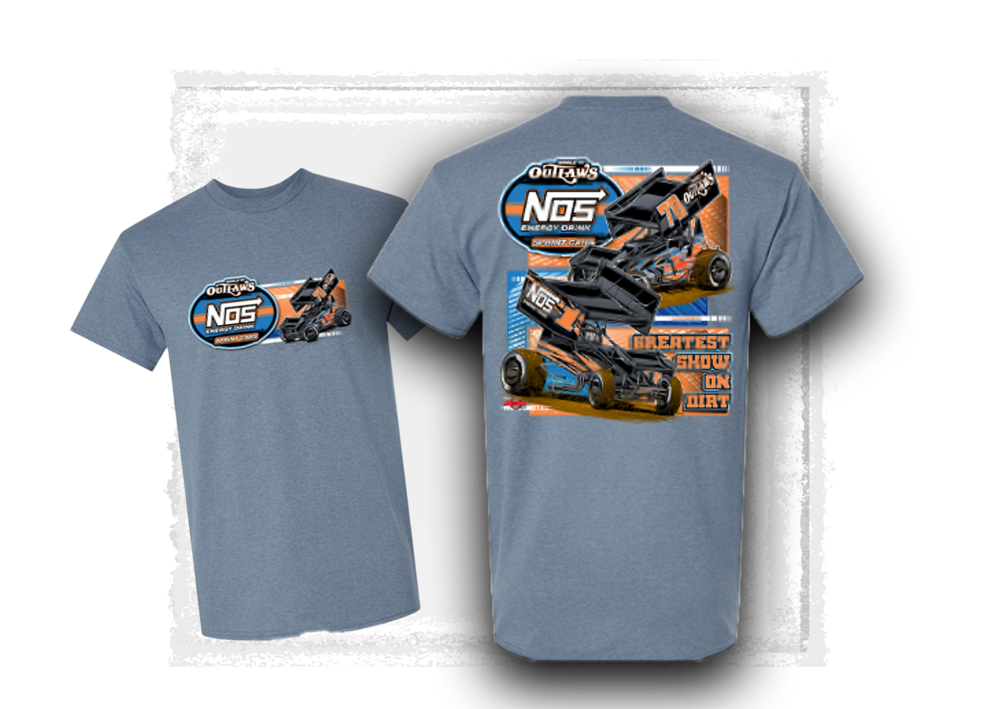 Double the power, double the action! The NOS Energy Drink Sprint Cars Deuce T-shirt showcases two fierce Sprint Cars in motion, bringing the thrill of dirt track racing to life. Printed on a comfortable Heather Indigo tee, this design captures the heart of the Greatest Show on Dirt—perfect for any dedicated Outlaws fan.