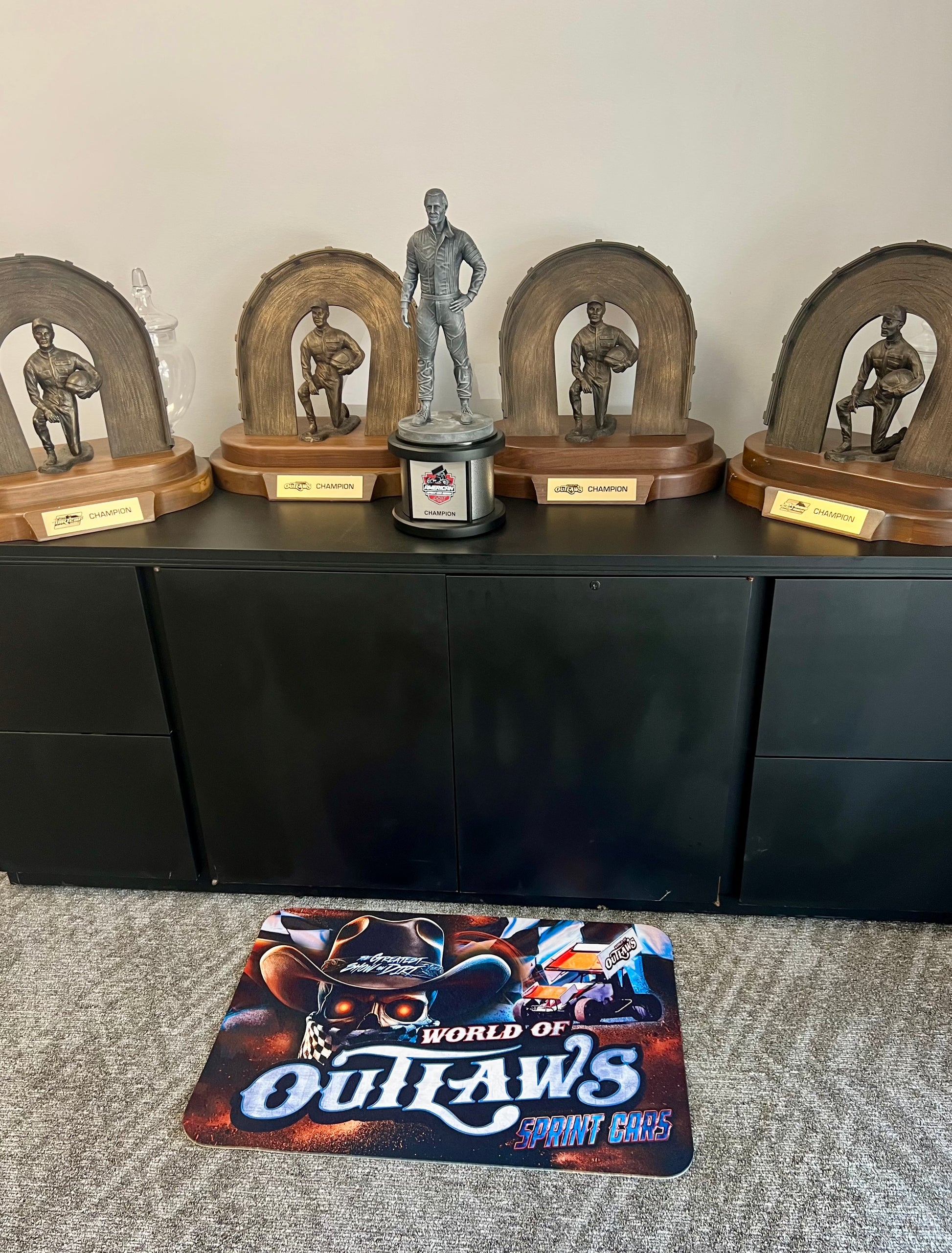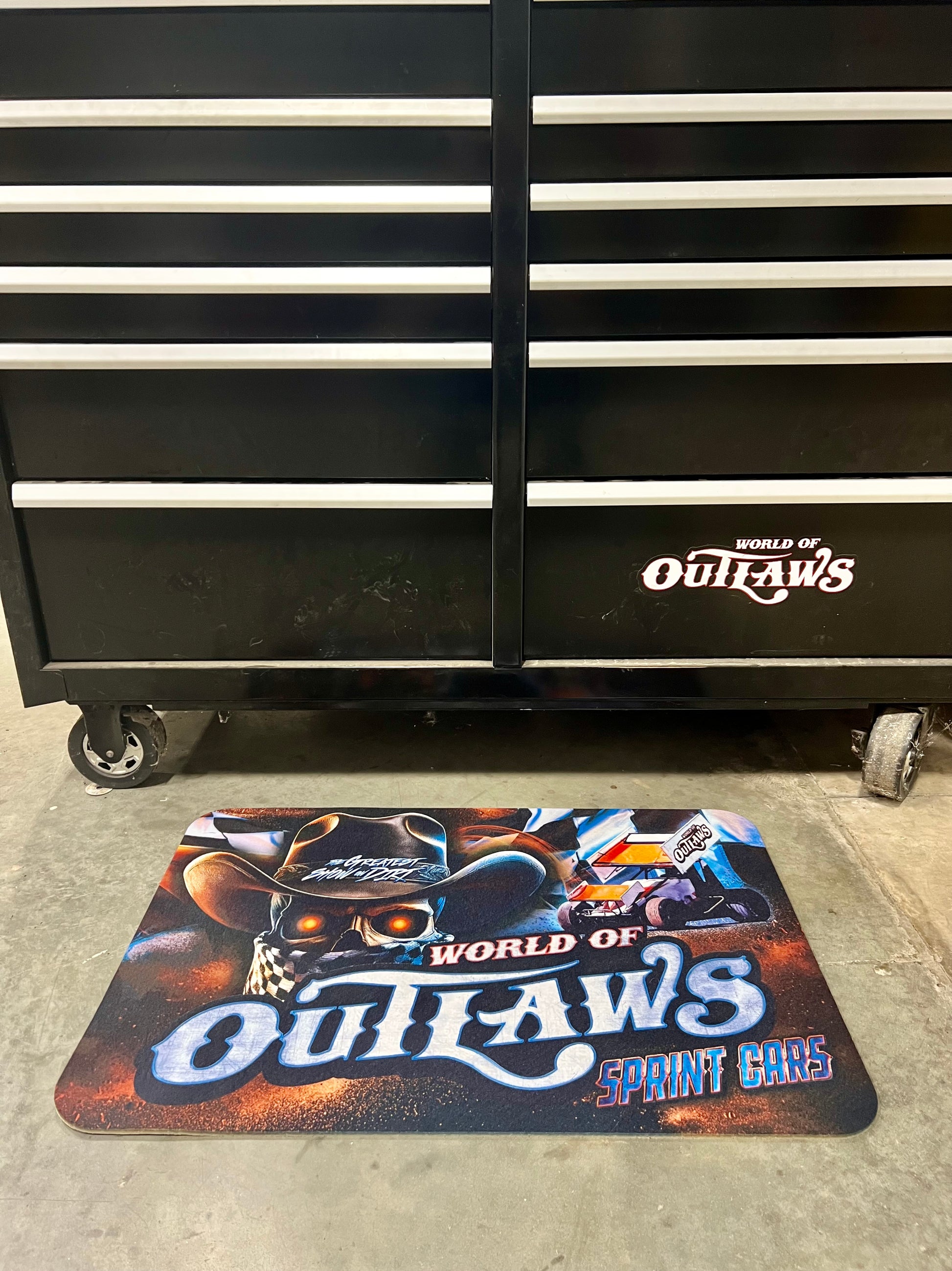 Bring the dirt track spirit indoors with the World of Outlaws Sprint Car Floor Mat. Measuring 20" x 30", this bold mat features a rugged cowboy skeleton, a high-powered Sprint Car, and the iconic World of Outlaws logo. A must-have for fans of The Greatest Show on Dirt, it adds attitude and adrenaline to any room, garage, or trailer.